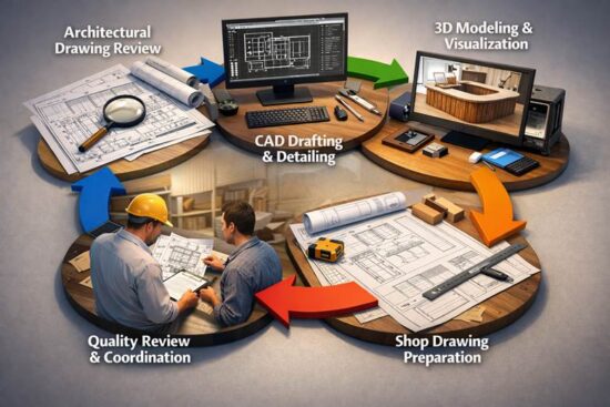 Architectural Millwork Drafting Services help architects convert design concepts into accurate production drawings. These drawings reduce construction errors, improve collaboration between designers and fabricators, and ensure millwork components fit perfectly within the building structure.